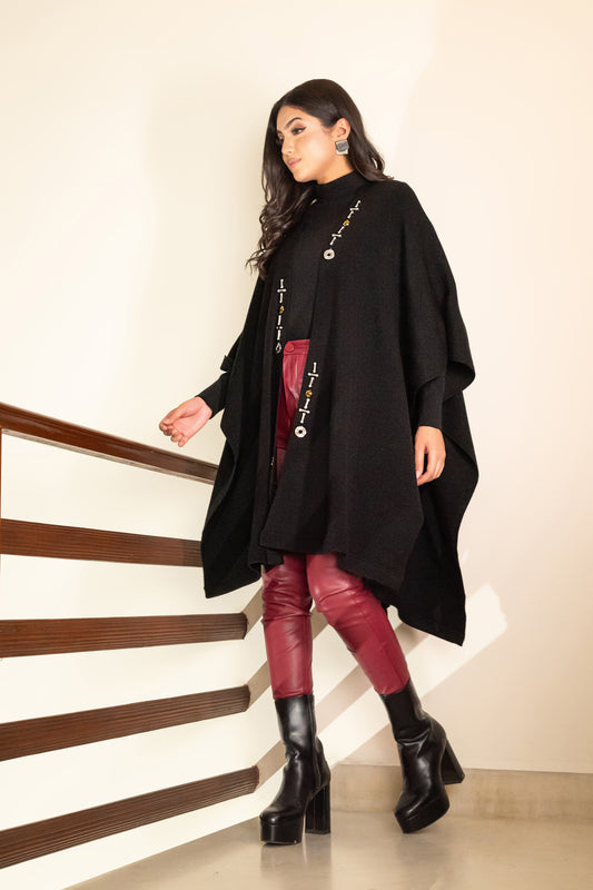 Round Neck Sleeve Slit Poncho with Hand Embroidered